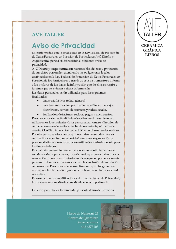 En AVE TALLER creemos que el arte transforma. Somos un taller de cerámica en Querétaro, una galería de arte gráfico y un estudio de diseño editorial que reúne creatividad, talento local y comunidad. Nuestro espacio está diseñado para quienes buscan crear, aprender y disfrutar de piezas únicas en cerámica, gráfica y literatura.