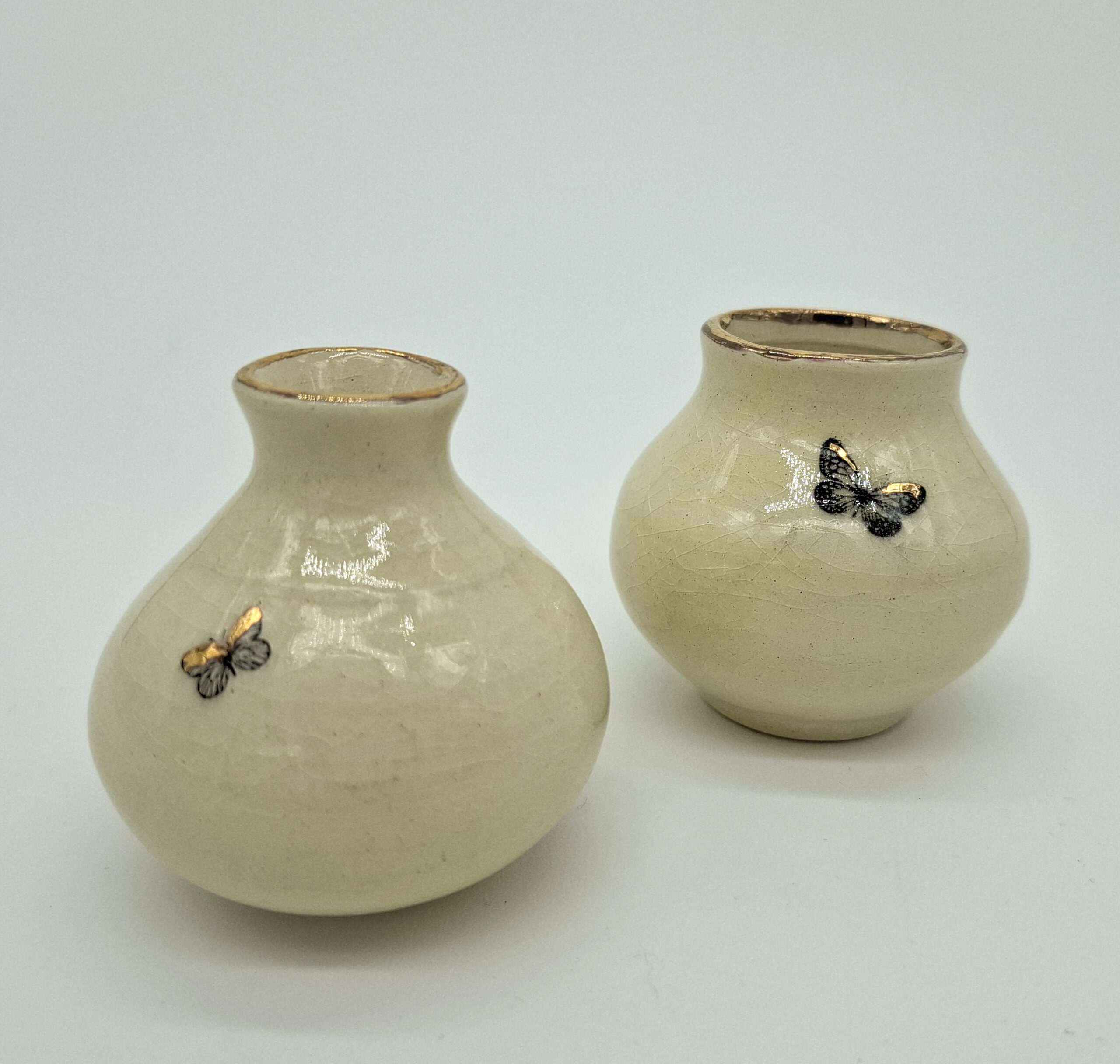 Botellas torneadas a mano con esmalte craquelado, estampado de mariposa y detalles en lustre de oro