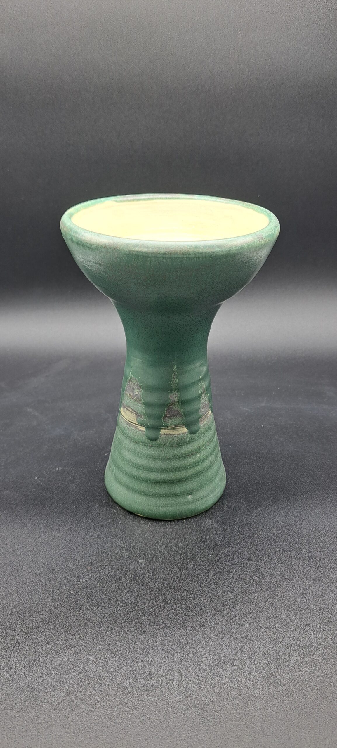 Pieza torneada con pasta tipo stoneware fórmula propia, esmaltes con óxido de cobre fórmula propia, quema de oxidación en horno de gas.