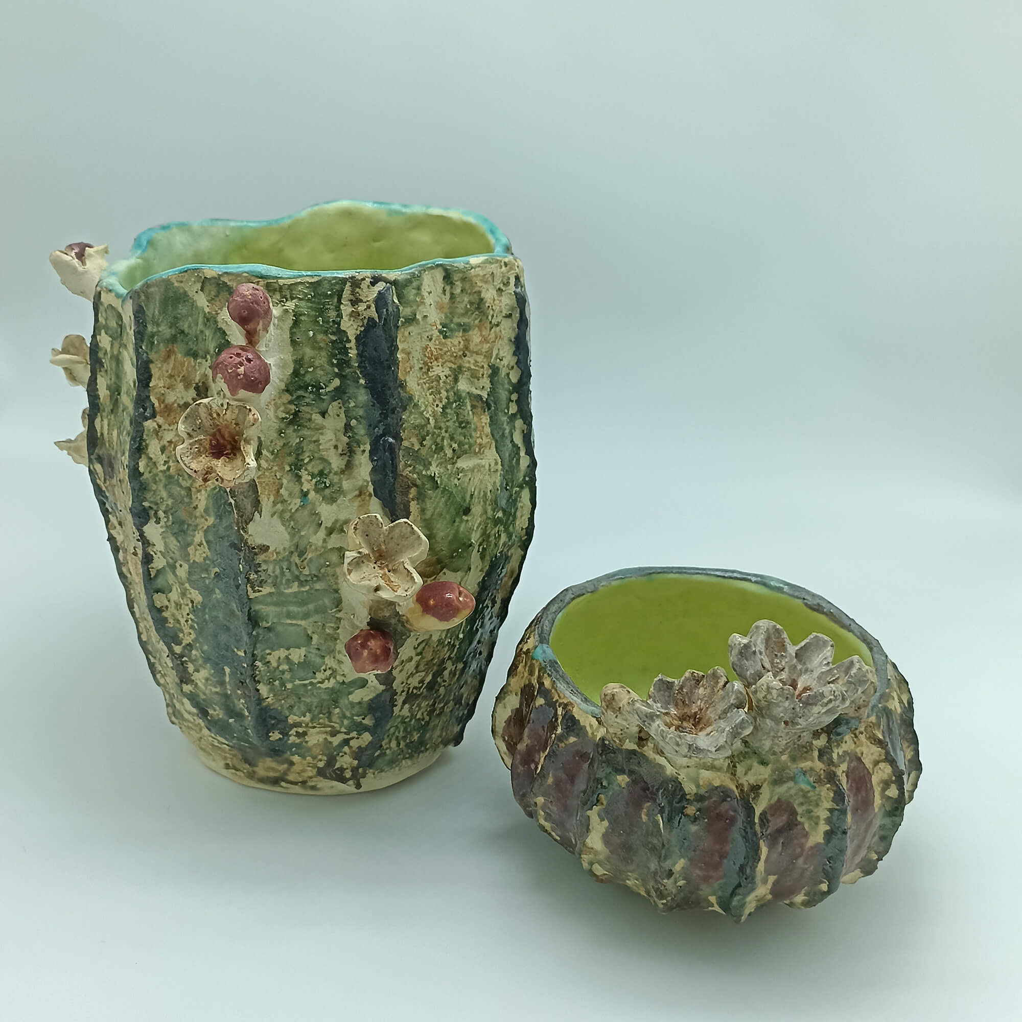 Juego de dos floreros modelados a mano stoneware con forma de cactacea y biznaga, aplicaciones de flores. La pieza grande mide