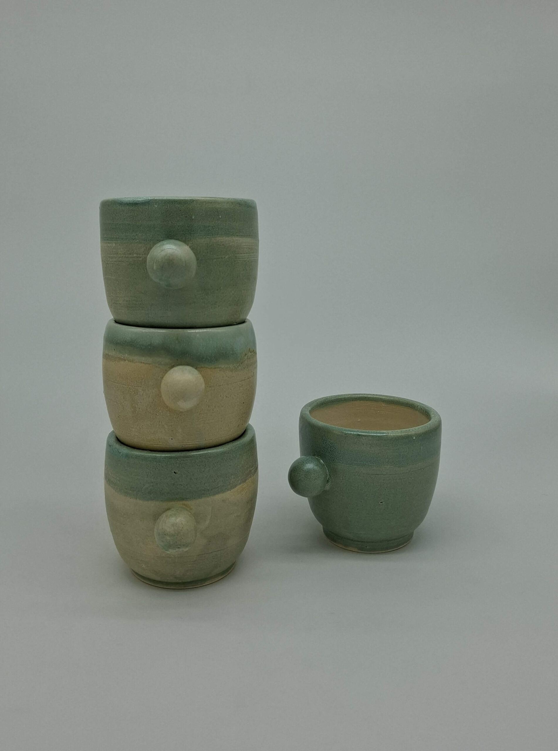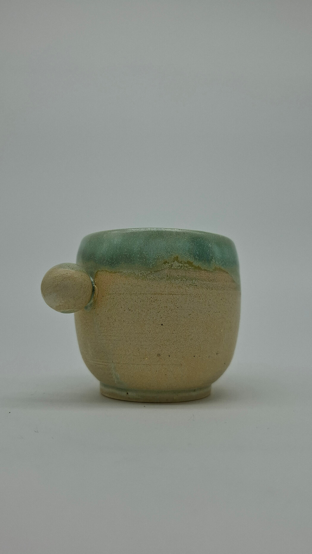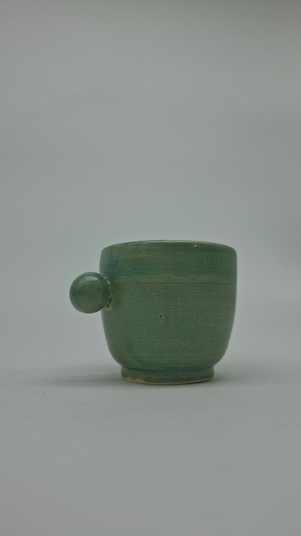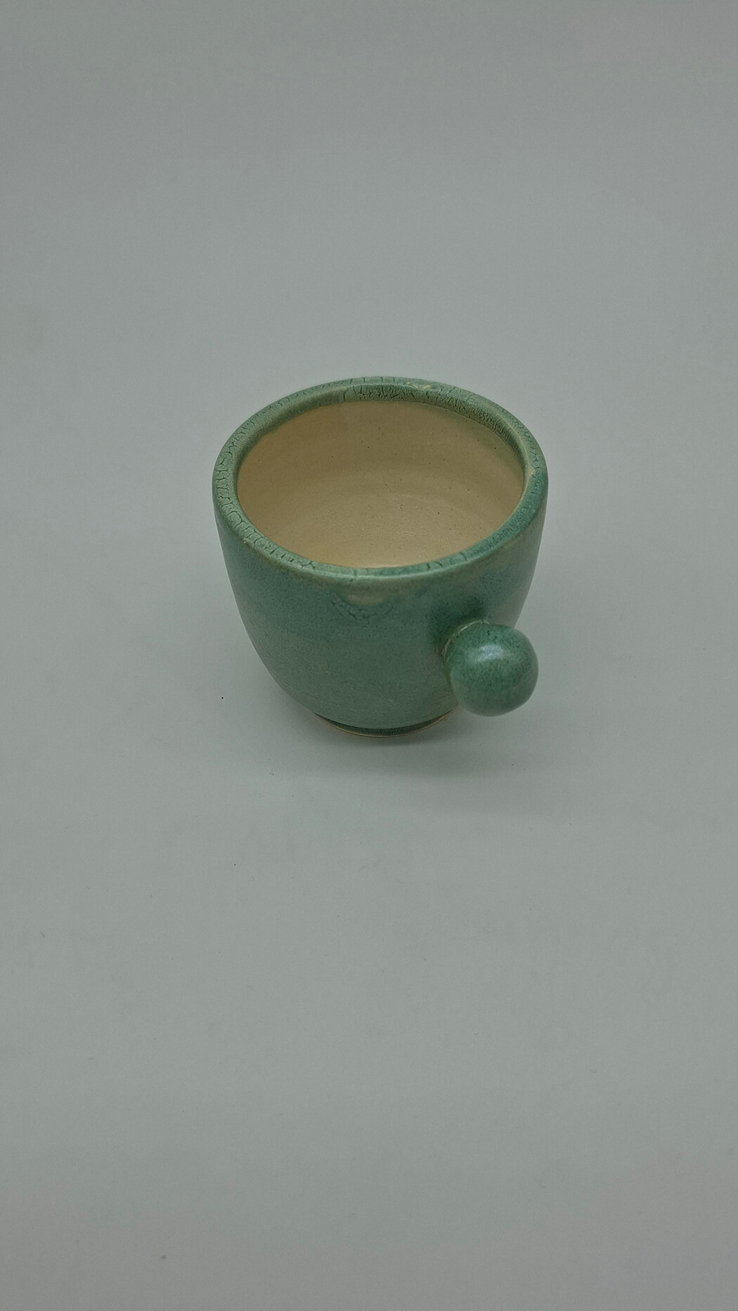 Taza para café expreso hecha a mano en torno de alfarero con asa en forma de bolita, esmalte blanco al interior verde semillas al exterior