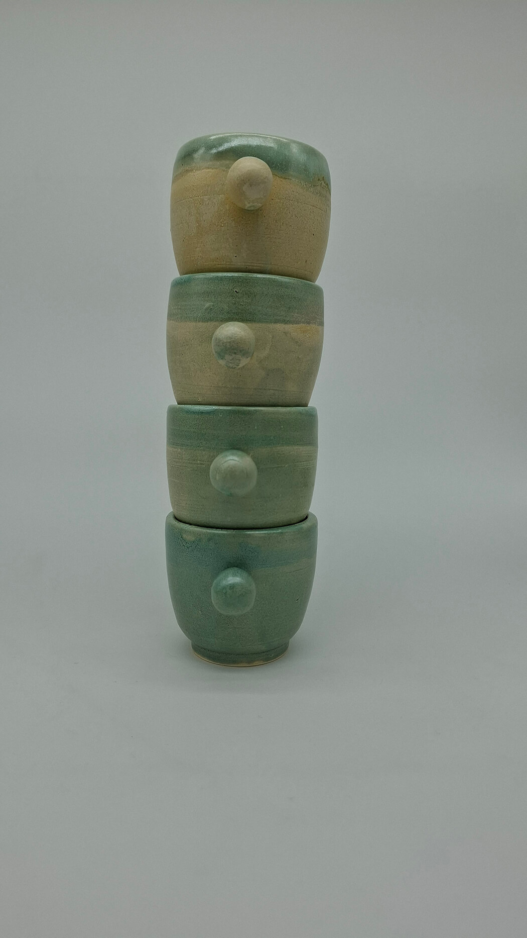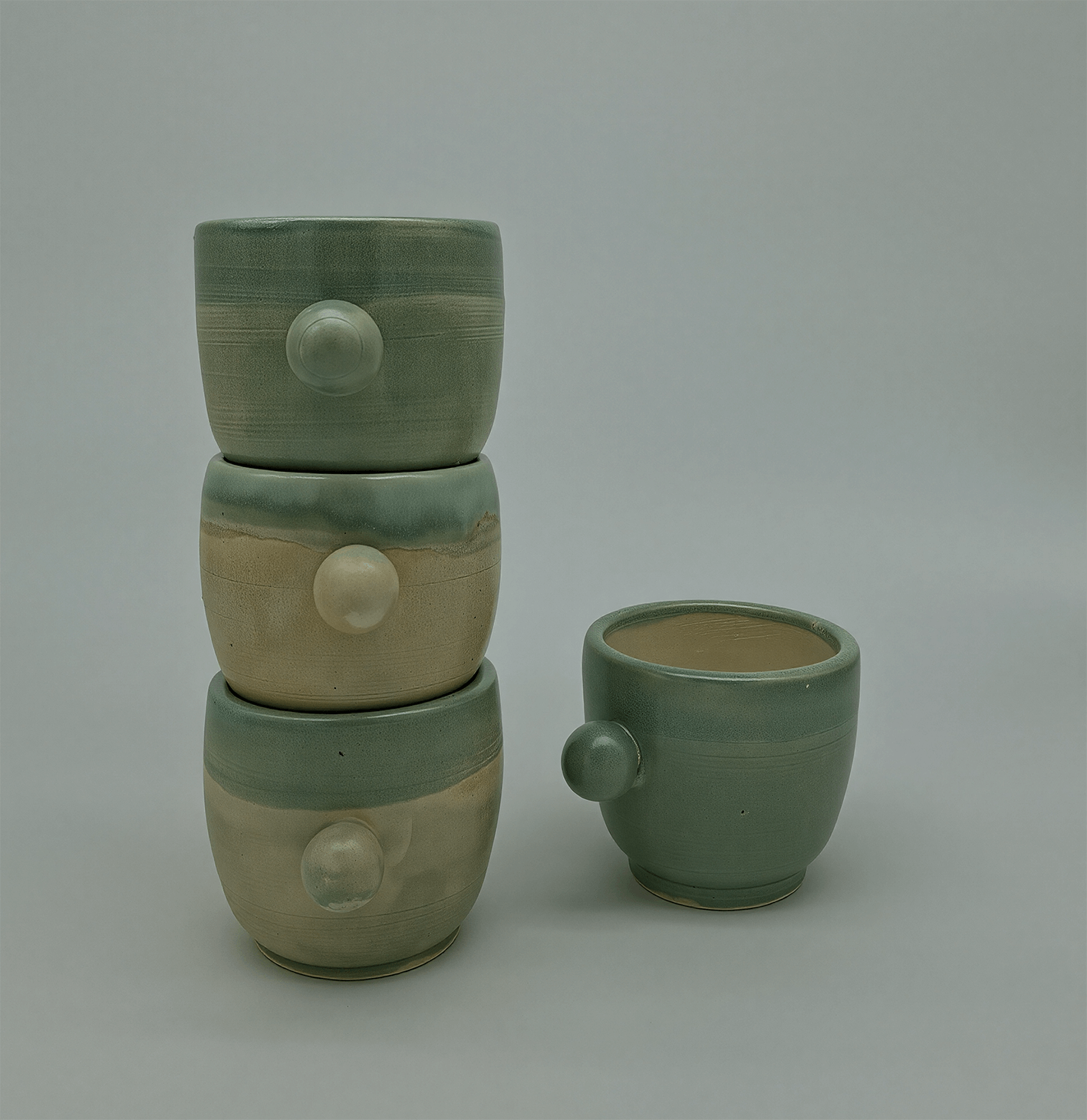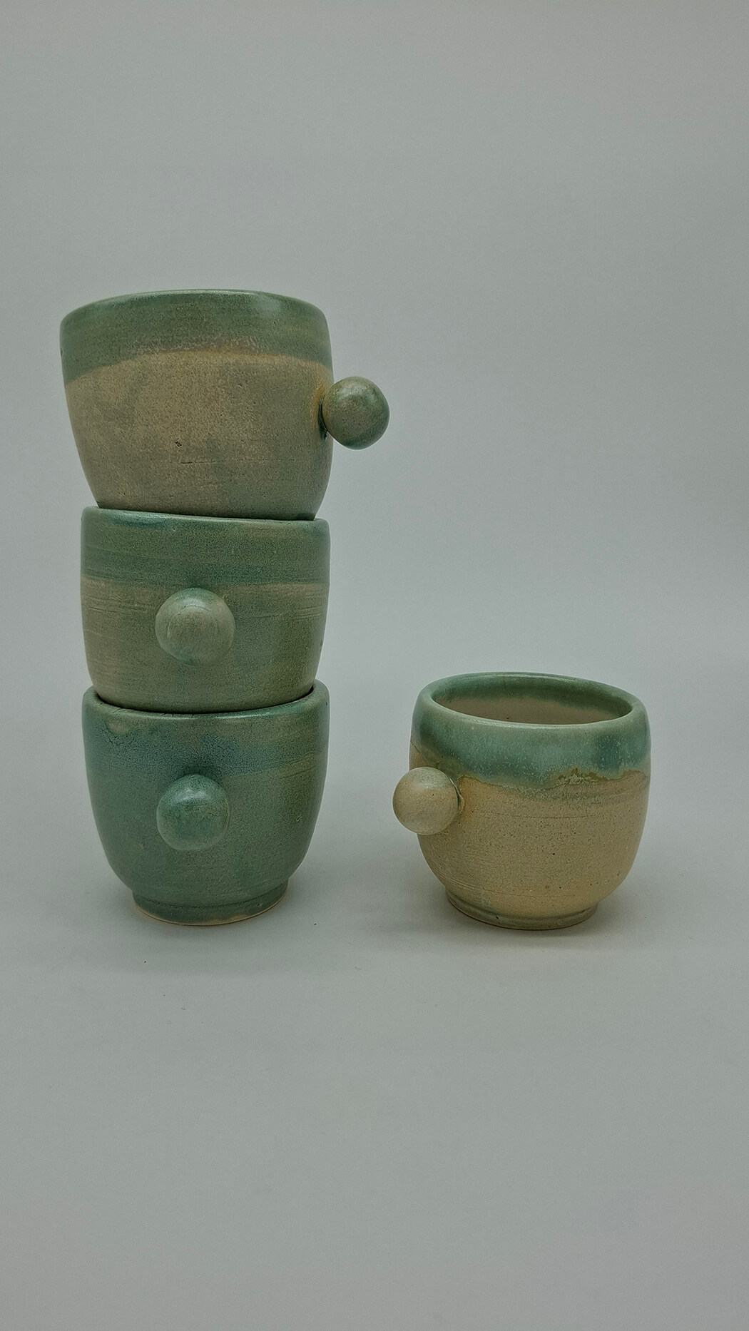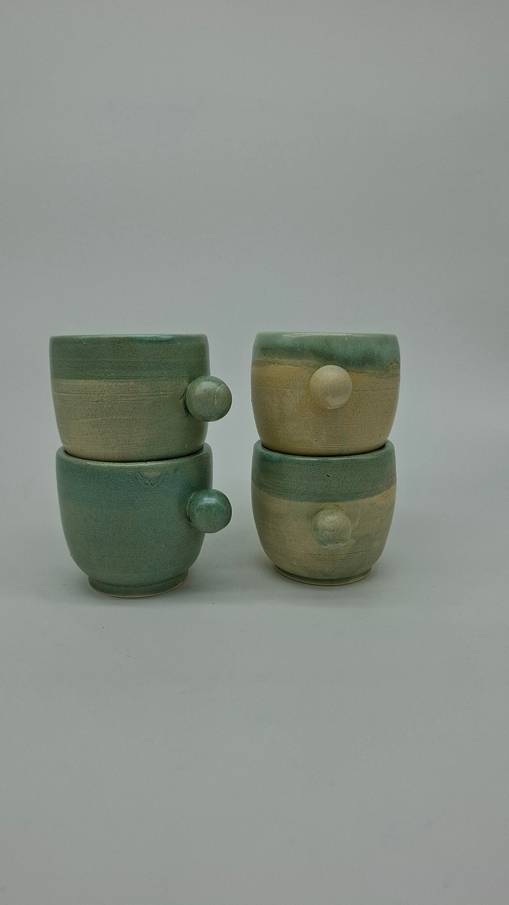 Taza para café expreso hecha a mano en torno de alfarero con asa en forma de bolita, esmalte blanco al interior verde semillas al exterior