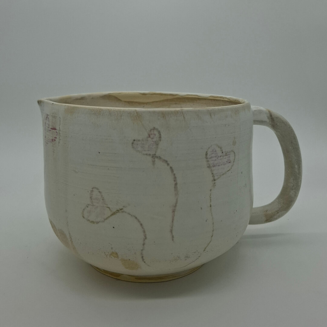 Tazón con asa para preparar mezclas de pasteles, hot cakes o batidos, con pico para servir. Modelado en torno y decorado a mano